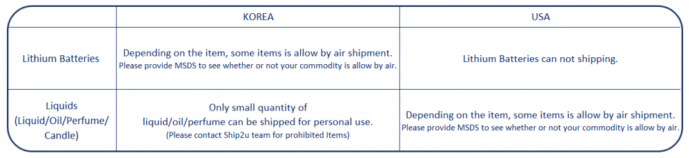 Ship2U use passenger airline to bring your items from Korea and USA. For the safety of the passengers, crew, and aircraft,the following items are either prohibited or restricted on all aircraft. Please ensure that you do not purchase items specified in this list